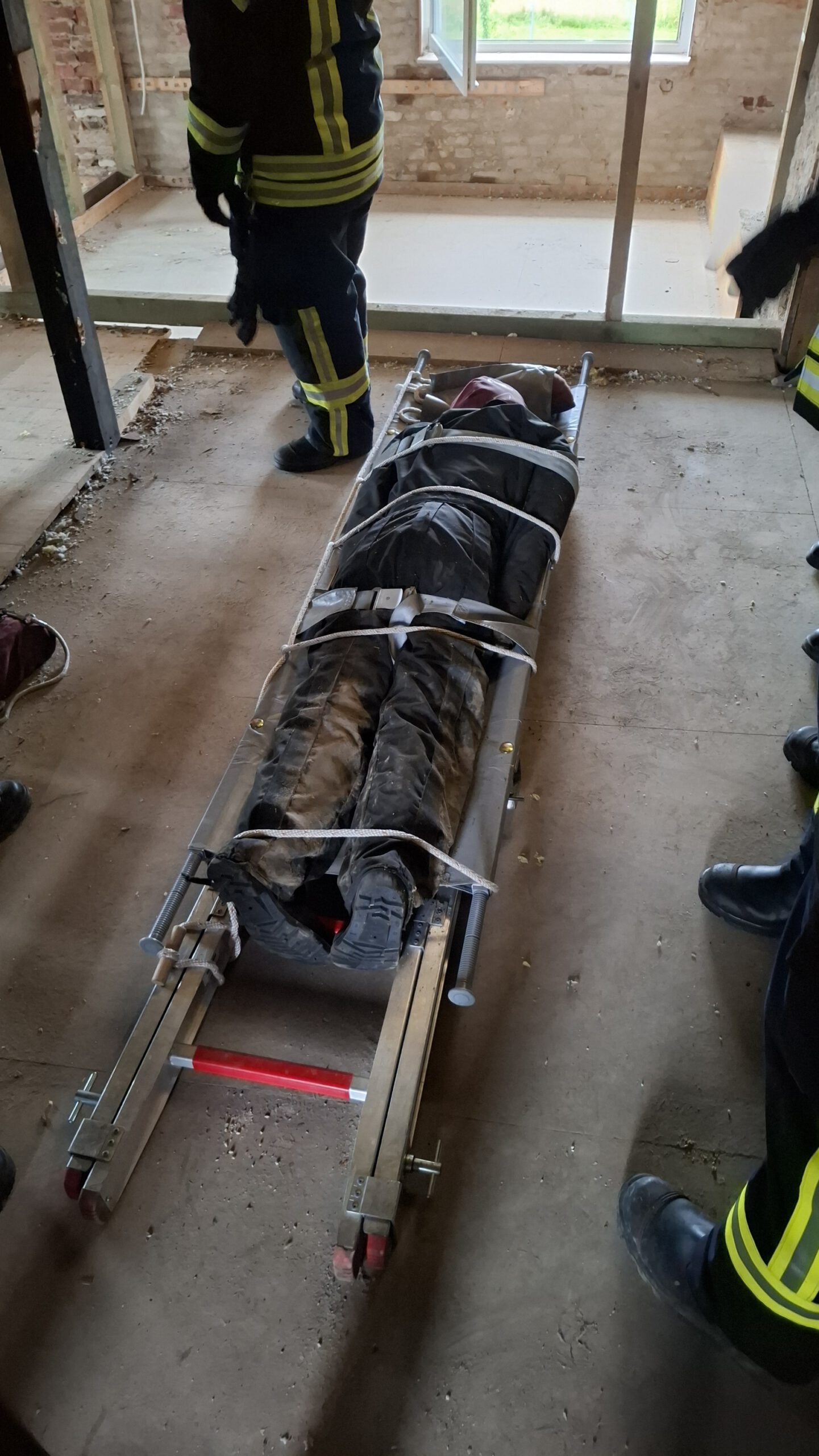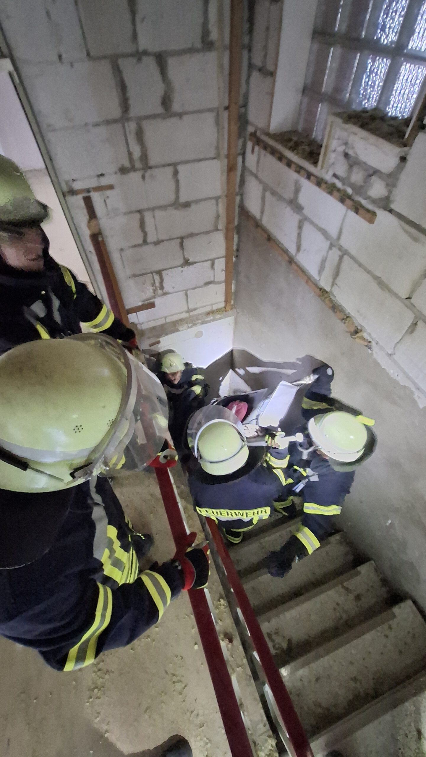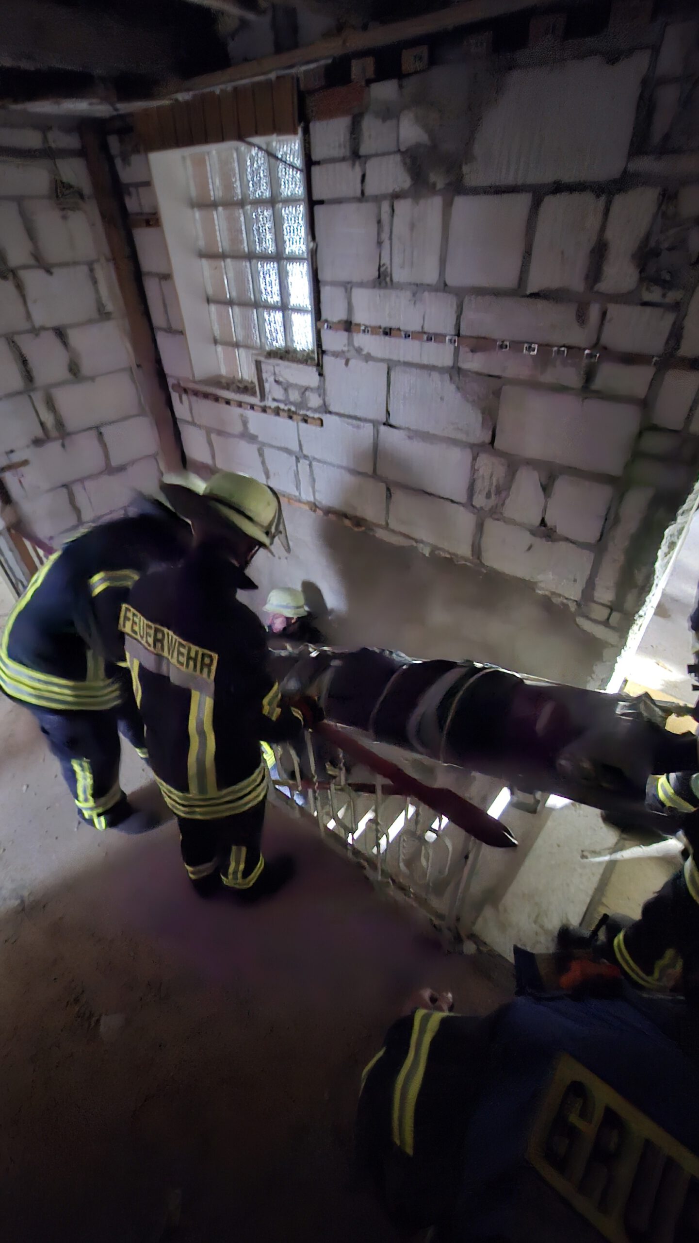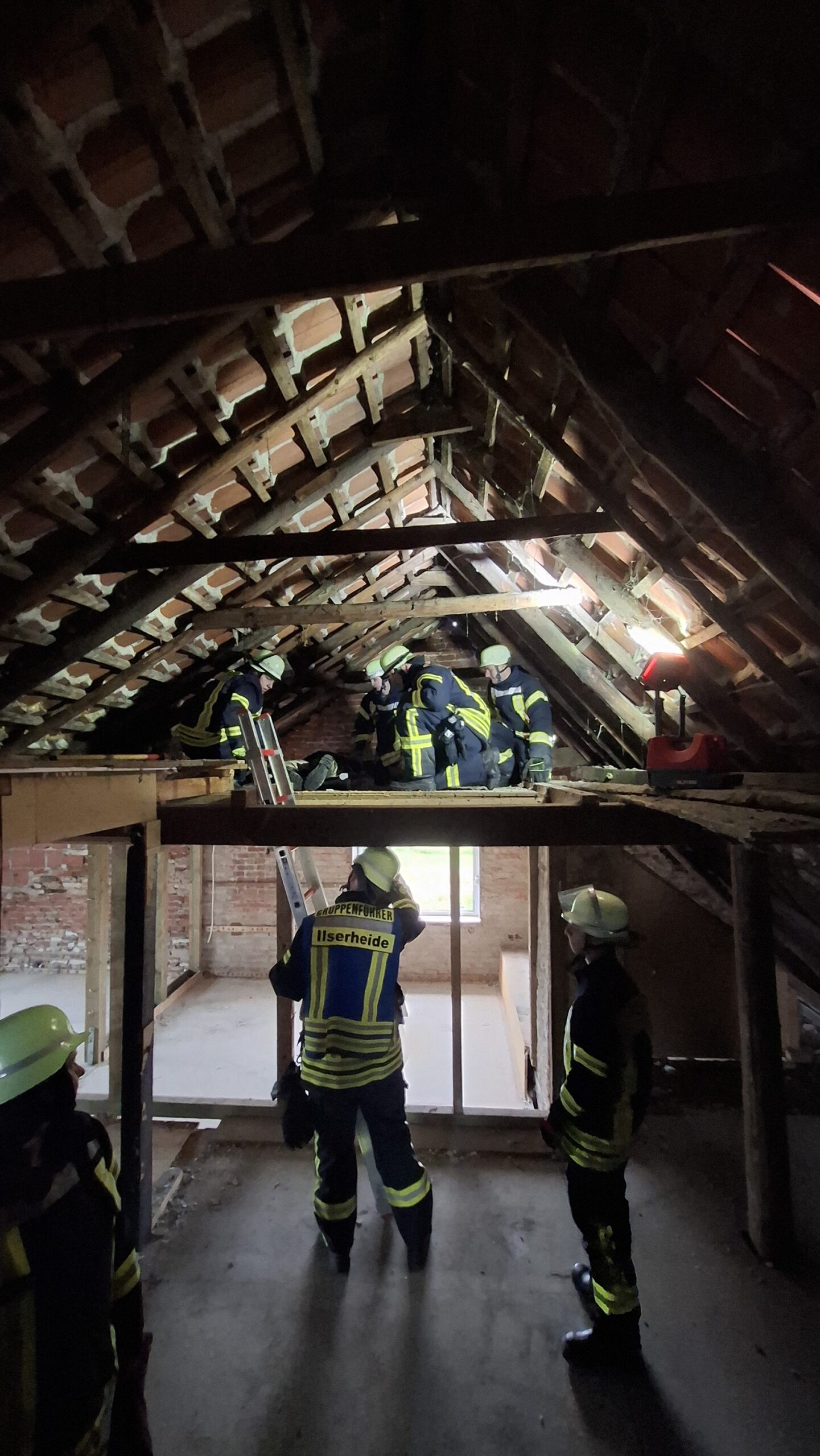 - Eine verletzte Person nach Bauunfall bei Renovierungsarbeiten. Die Person musste anhand von Hilferufen gefunden und gerettet werden, damit sie dem Rettungsdienst übergeben werden kann. Der Unfallort war auf einem Spitzboden oberhalb des 1.OG. Der Patient wurde zur technischen Rettung auf einer Trage eingebunden und musste anschließend durch ein enges Treppenhaus ins freie transportiert werden.