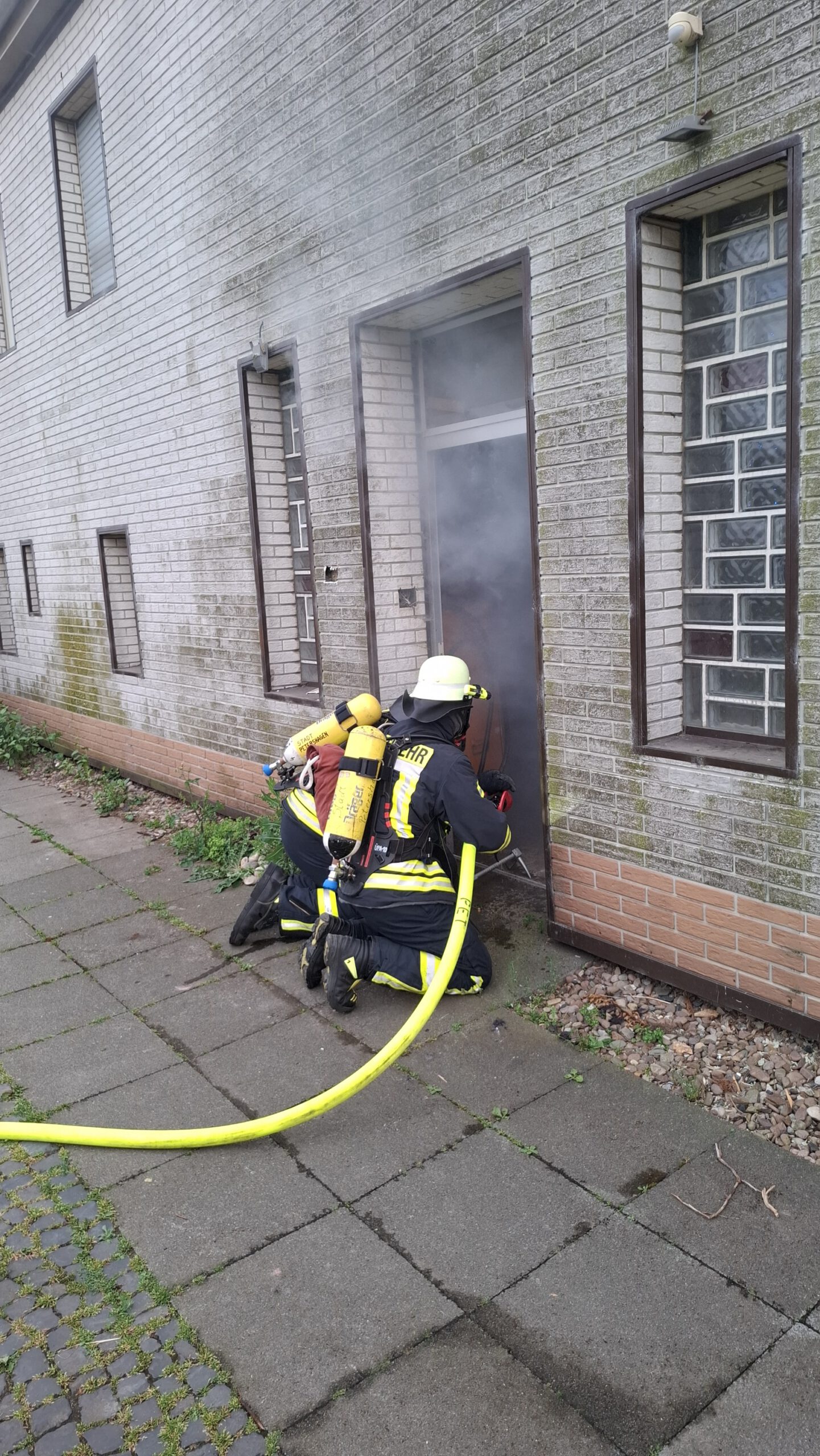 Geübt wurde nass, also mit gefüllten Schläuchen und tatsächlicher Abgabe von Wasser im Gebäude, um die Übung so realitätsnah wie möglich zu gestalten. Insgesamt waren zwei Löschgruppenfahrzeugen LF10 + LF20 vor Ort, um drei Übungszenarien abzuarbeiten.