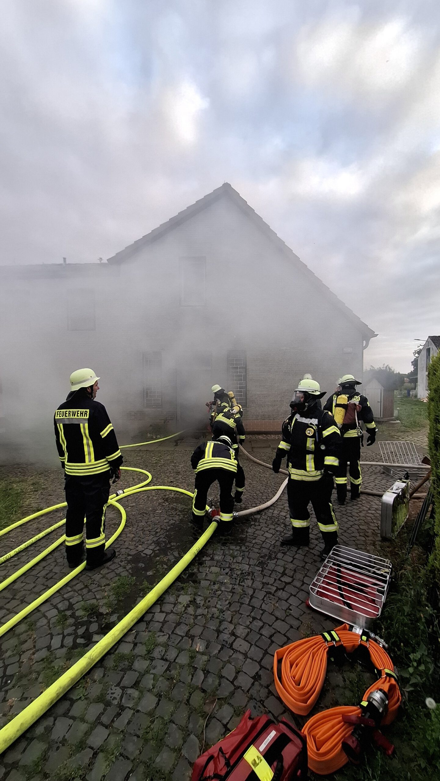 - Wohnungsbrand im EG mit zwei vermissten Personen und einer dritten Person am Fenster im 1.OG. Die zwei vermissten Personen wurden schnell gefunden und die dritte Person mittels Steckleiter gerettet. Als zusätzliche Schwierigkeit wurde ein Atemschutznotfall „Mayday“ eingespielt, um auch für diesen Fall das Vorgehen zu üben und erneut ins Gedächtnis zu rufen.