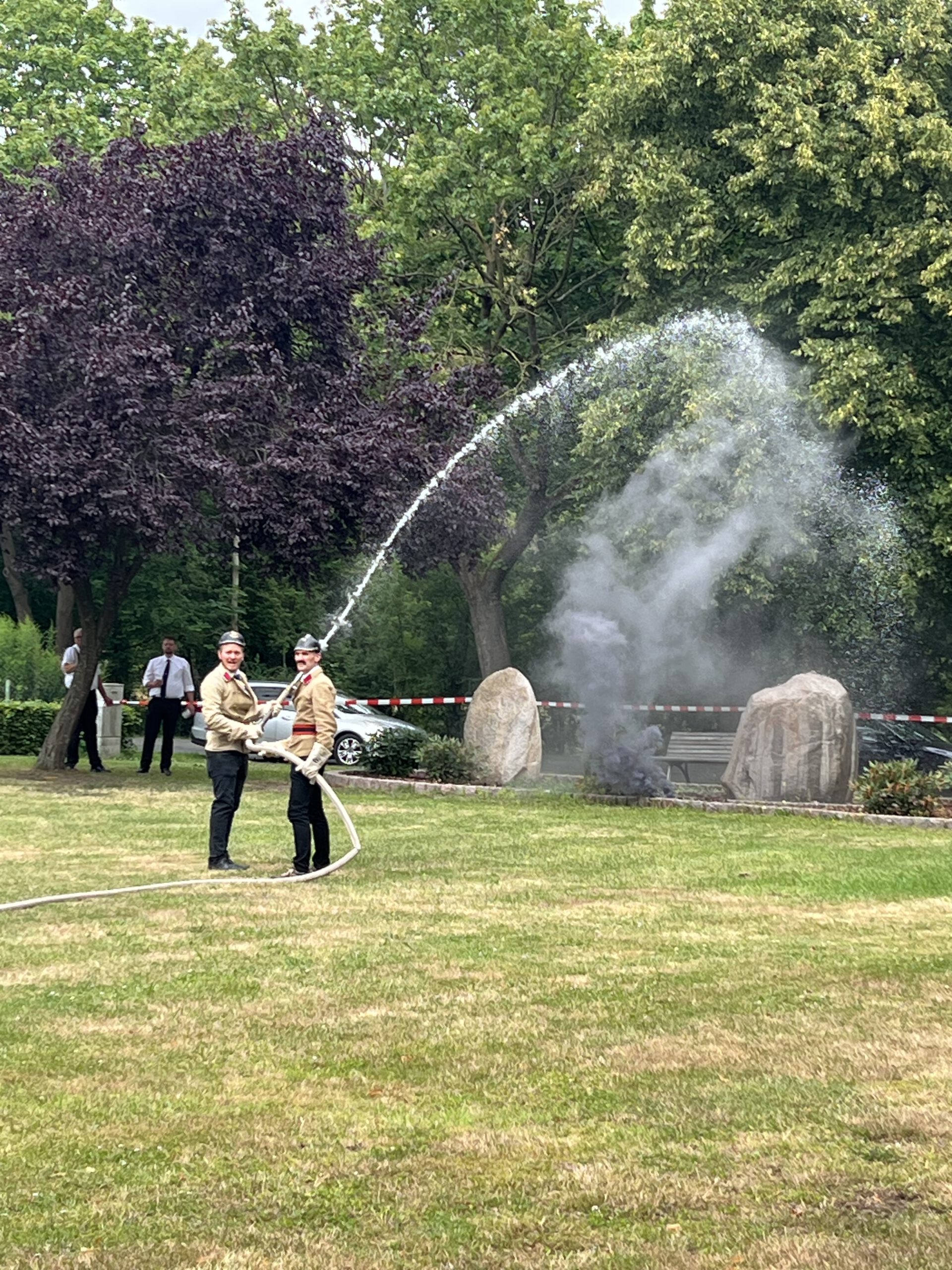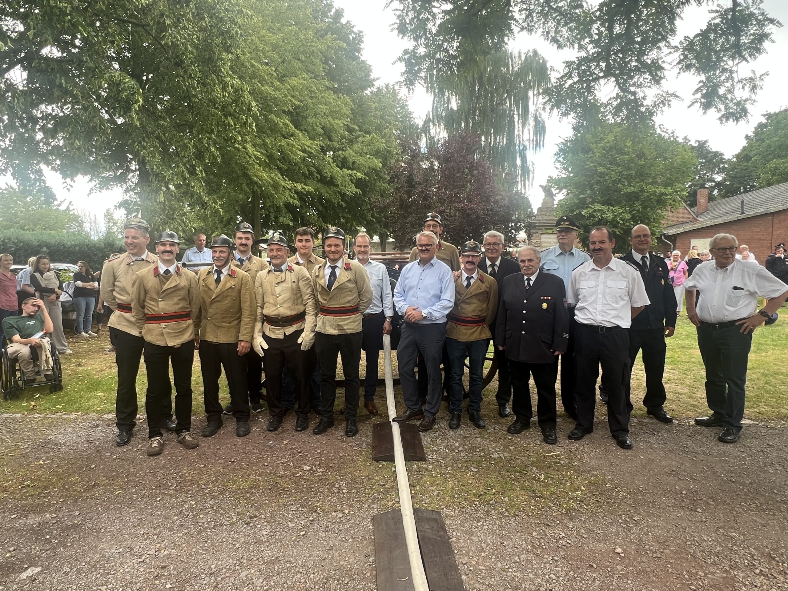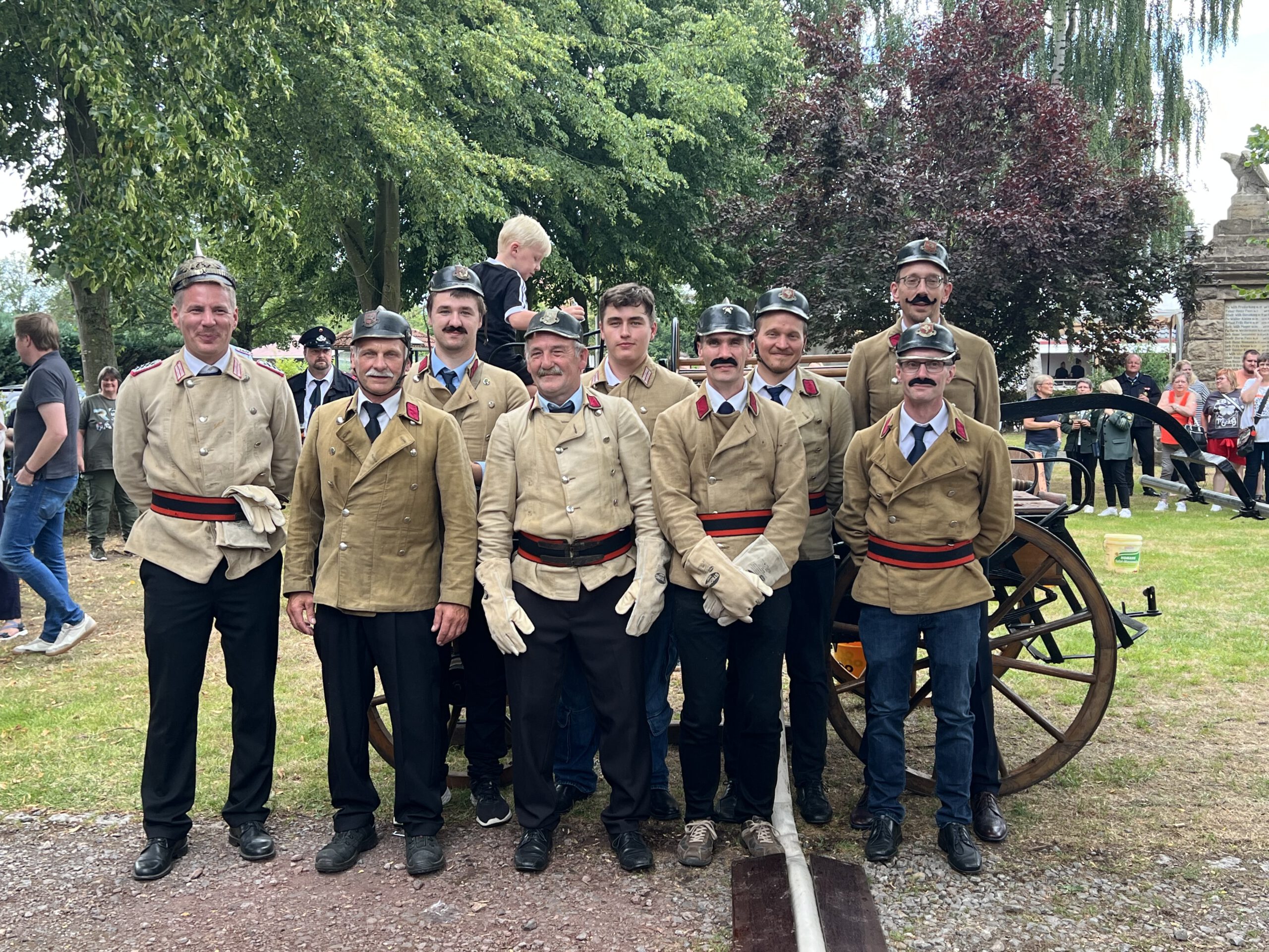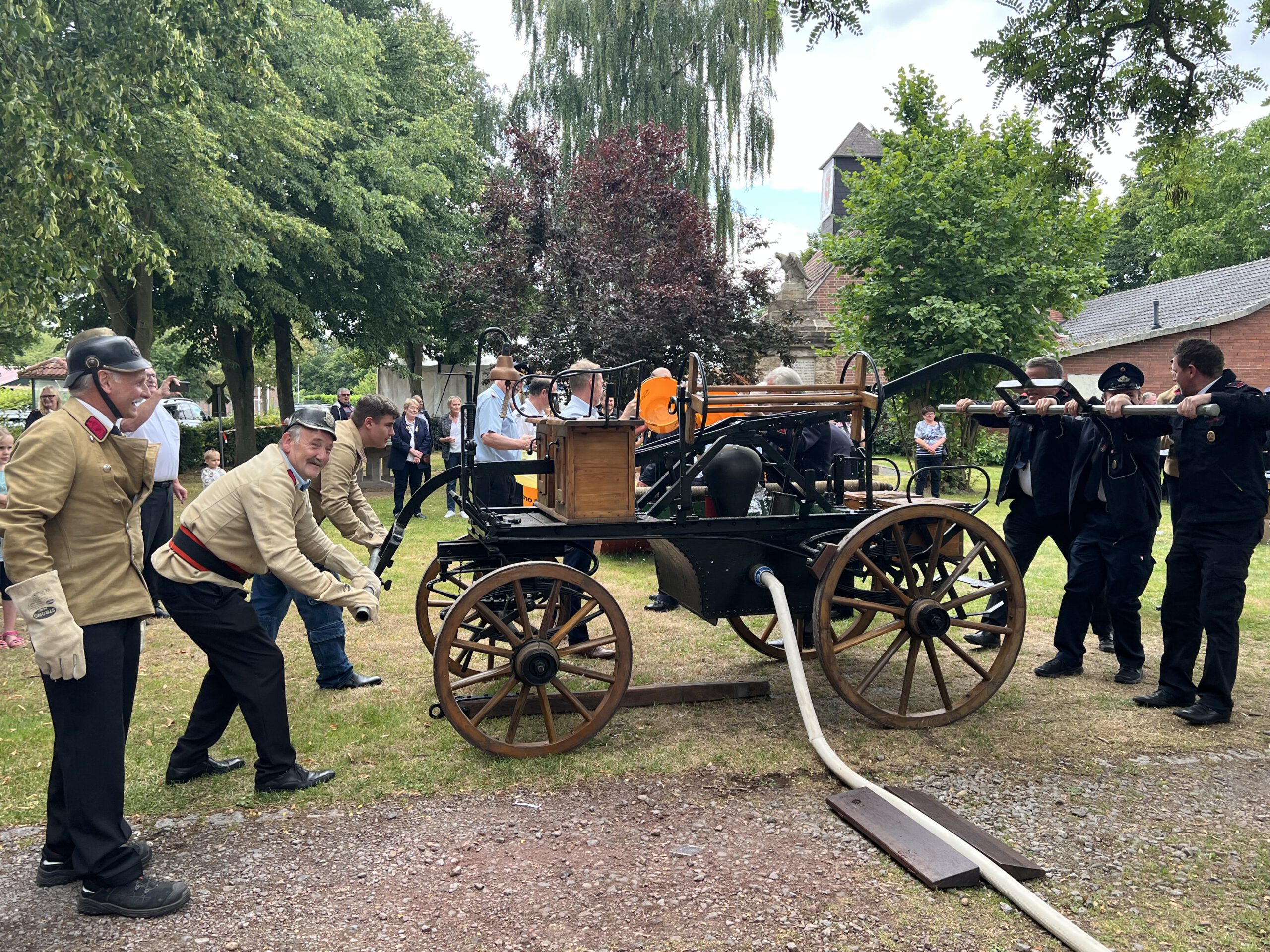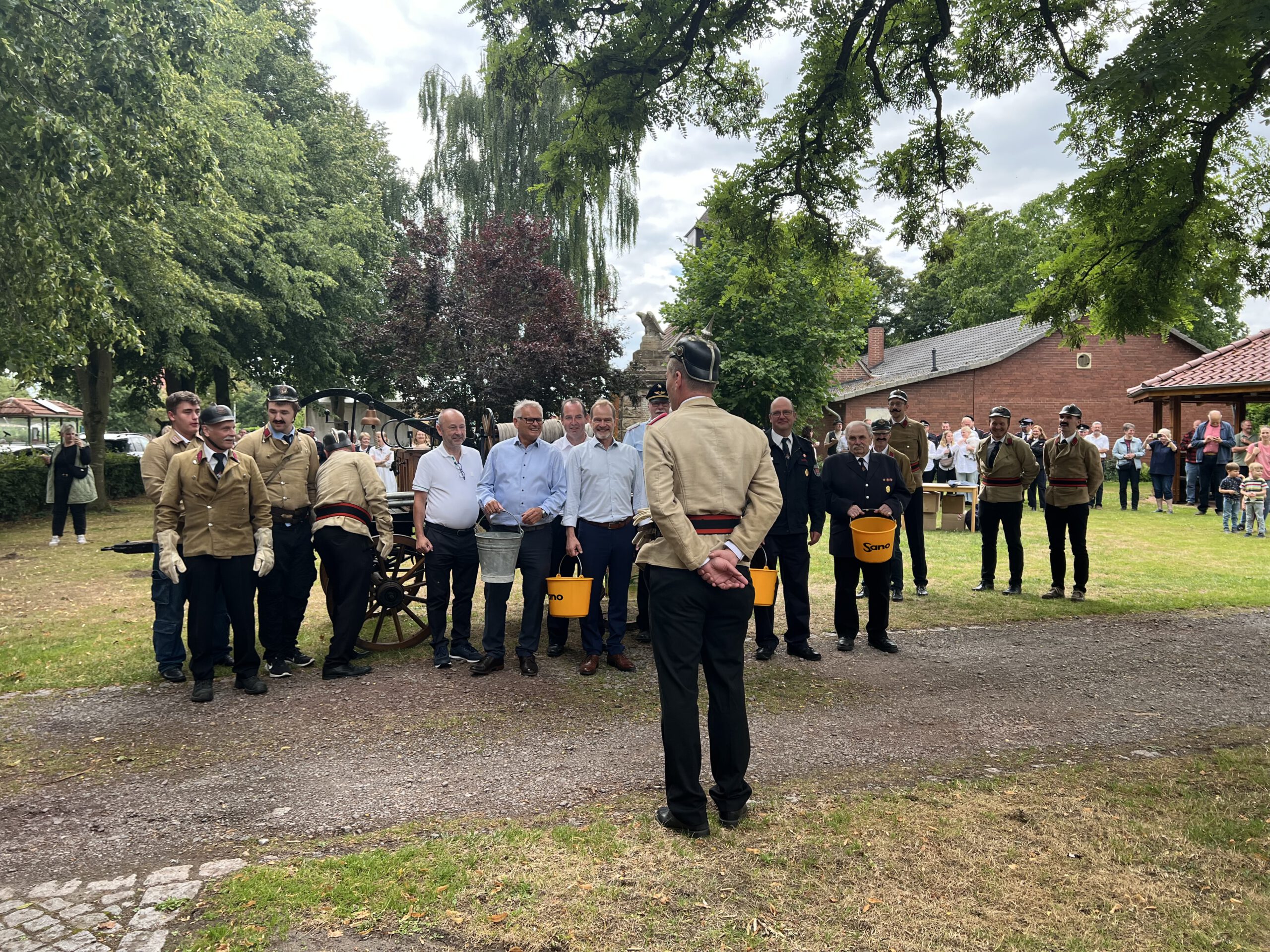 Nach einer kleinen Pause, in der sich die Besucher mit Kaffee, Kuchen, Bratwurst oder Pommes stärken konnten, ging es weiter mit einer Vorführung der historischen Handdruckspritze. Die aktive Abteilung der Löschgruppe Meßlingen hat sich dazu eine Übung überlegt und einige Zuschauer mit eingebunden.