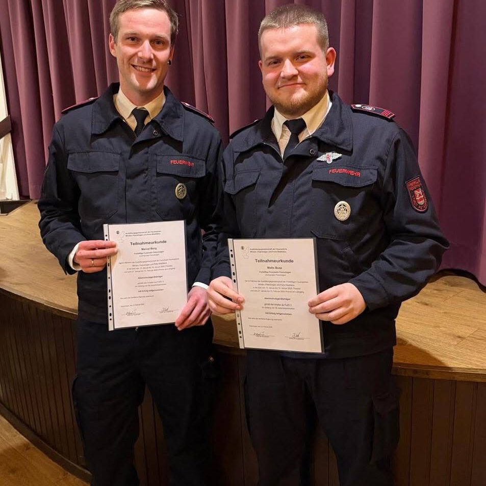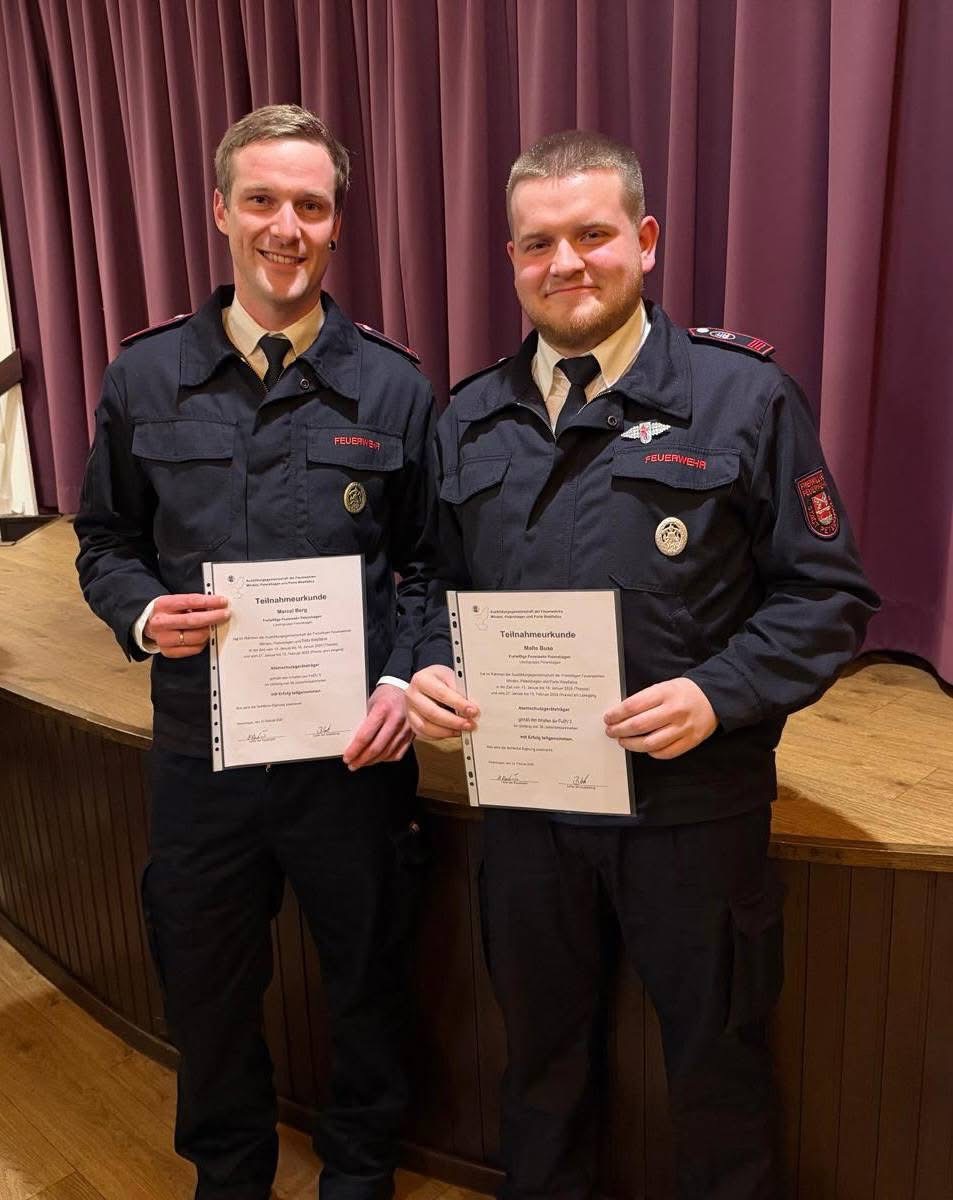 Für die erfolgreiche Teilnahme am Leistungsnachweis in Hille erhielten Tobi Braun und Oliver Stein das Leistungsabzeichen in Bronze, Cord-Heinrich Schmidt in Silber, Finn-Lucas Deymann in Gold und der Löschgruppenführer Martin Buse in Gold mit der Zahl 30.