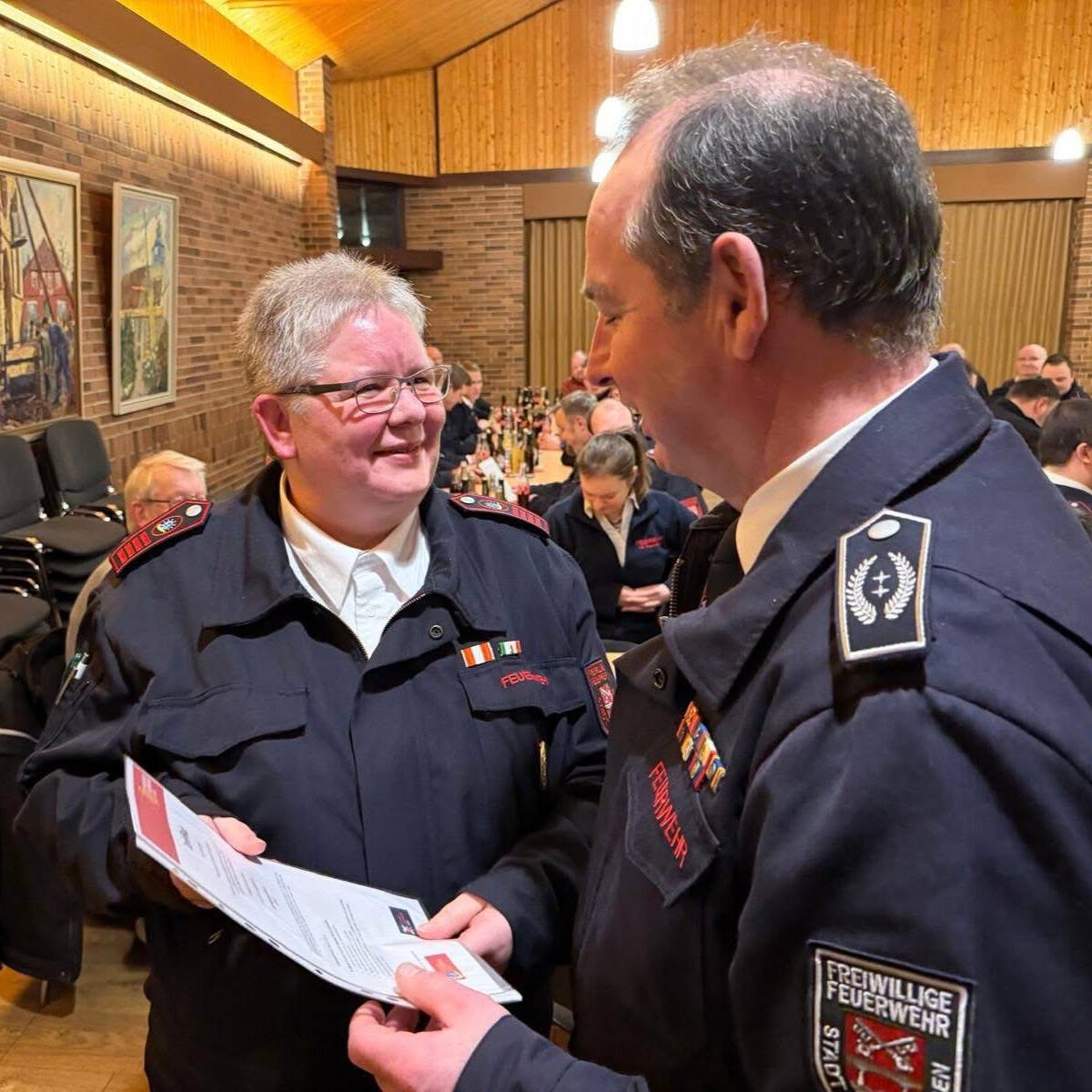 Wehrführer Horst Beckemeier beförderte Rebekka Seidemann zur Oberfeuerwehrfrau und Cord-Heinrich Schmidt zum Oberfeuerwehrmann.