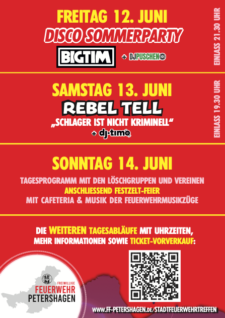 Der Sonntag, 14. Juni steht ganz im Zeichen der Feuerwehr. Aus dem ganzen Stadtgebiet reisen die Kameradinnen und Kameraden an, unterstützt von ihren befreundeten Wehren aus der Umgebung und darüber hinaus, und treten zum großen Apell an. Neben einer Fahrzeugschau und den Reden der Ehrengäste stehen die Beförderungen und vor allem die Ehrungen einzelner Kameradinnen und Kameraden im Vordergrund. Nach dem offiziellen Teil folgt der gemütliche Teil auf dem Festzelt. Die Feuerwehrmusikzüge der Stadt Peterhagen unterhalten uns dabei mit klassischer Blasmusik und modernen Interpretationen.