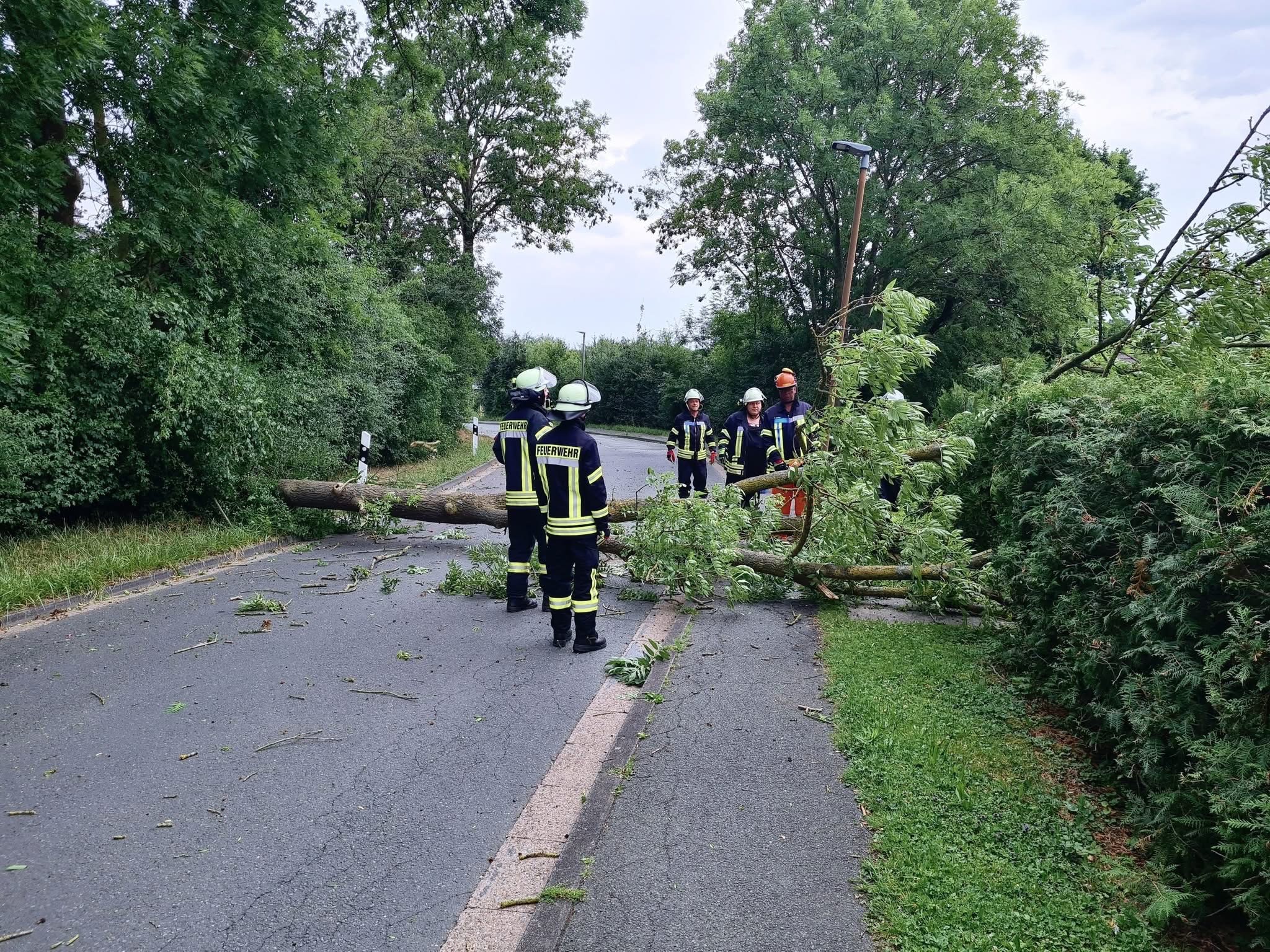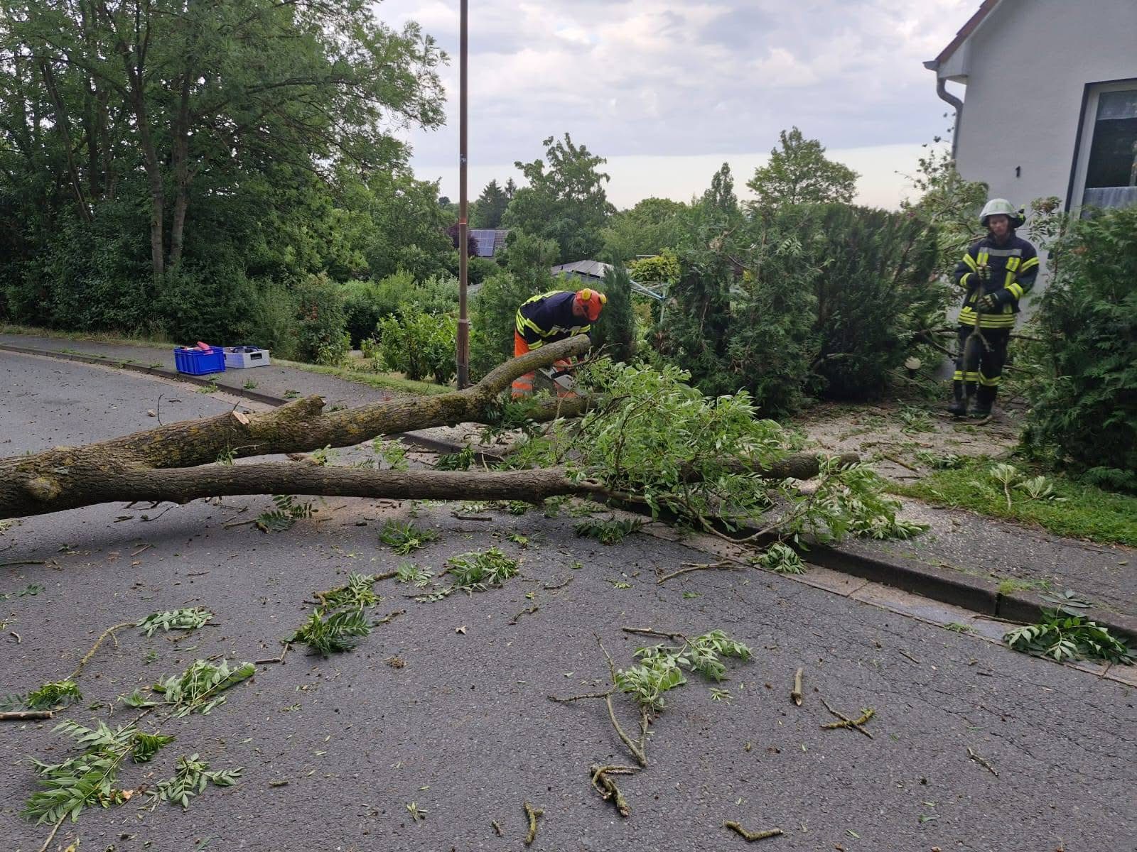 Es versperrte ein Baum die Fahrbahn vollständig. Die Feuerwehr sägte diesen in Stücke und räumte ihn von der Straße.